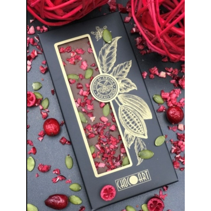 Состав Молочный шоколад, содержащий 35% какао (тростниковый сахар, какао тертое, какао масло, цельное сухое молоко, натуральная ваниль, лецитин), клюква, тыквенные семечки