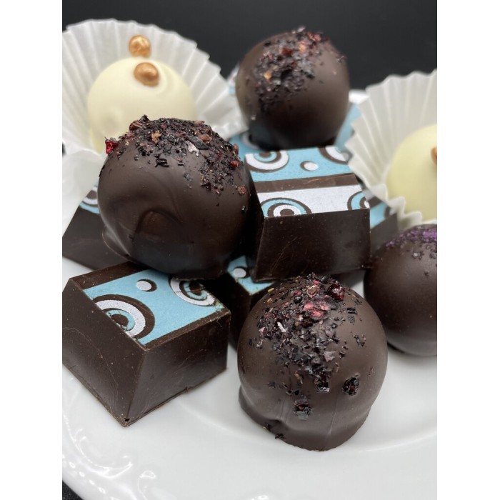 Начинка: сливочный ганаш со вкусом черной смородины; корпус: горький шоколад 65% или белый шоколад 37% |